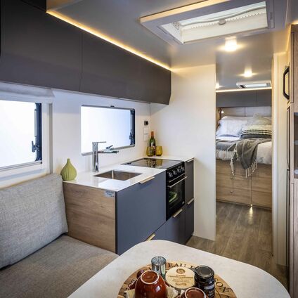 There's room for four in the Oakura 354. This model features the popular island bed, a bedroom that can be closed off from the lounge, a completely separate shower and toilet, and a spacious kitchen area and lounge for living.
